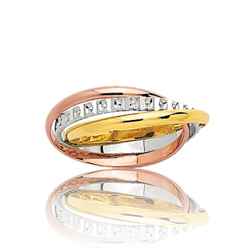 Alliance composée de 3 anneaux demi-joncs entrelacés de couleurs d'or différentes, dont celui en or blanc est lapidé diamanté.