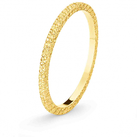 Le lapidage sur trois côtés est un travail orfèvre traditionnel qui crée une texture captivante. Il reflète la lumière de manière délicate et donne du caractère à votre anneau en sublimant l'or jaune.