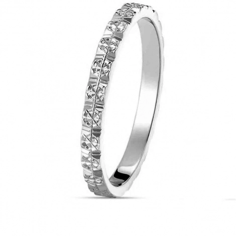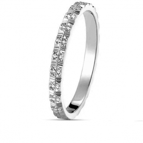 Dotée d'une largeur de 2 mm et d'une épaisseur de 1,2 mm, cette alliance épousera parfaitement votre doigt. Le design de ce jonc mariage propose des motifs à effet diamanté qui créent un jeu de lumière captivant. La finition polie met en valeur chaque détail de cet anneau or blanc poncé, tandis que l'intérieur plat assure un confort optimal au quotidien.
