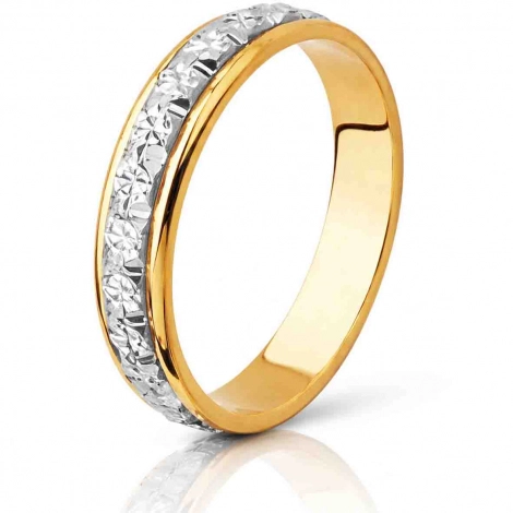 Cette alliance mariage est composée de deux ors : une base en or jaune 18 carats pour la stabilité et un anneau central en or blanc encastré avec motifs carrés en lapidage diamanté pour l'élégance.