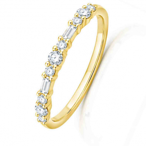 La taille baguette offre des facettes rectangulaires qui créent des lignes épurées et modernes, tandis que la taille brillant multiplie les facettes pour maximiser la brillance et le scintillement du diamant. Cette combinaison sur notre alliance crée un équilibre entre élégance structurée et éclat lumineux.
