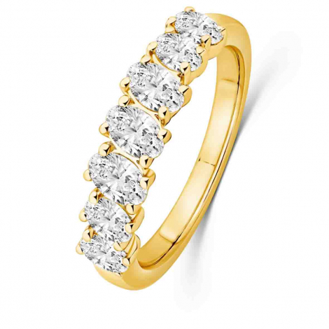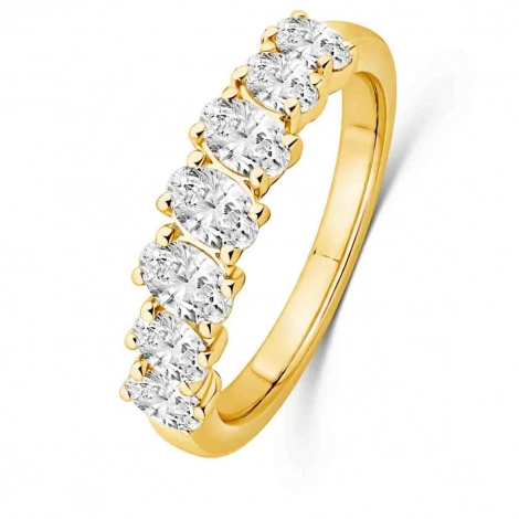 Découvrez l'élégance intemporelle de cette alliance demi-tour ornée de diamants en sertissage griffe. Conçue en or 18 carats à 750/1000, cette bague de mariage allie raffinement et solidité pour accompagner vos plus beaux moments. Cette alliance diamant femme présente une remarquable composition de diamants blancs de taille ovale, d'une pureté G-VS garantissant une brillance exceptionnelle. Le poids total des diamants atteint 1.05 carats, avec un diamant de centre de 0.20 ct qui structure l'ensemble avec grâce.