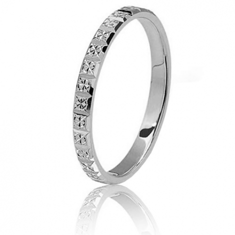 Large de 2 mm l'alliance est lapidée sur une rangée avec des motifs en forme de carré de chocolat diamanté.