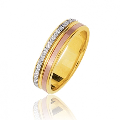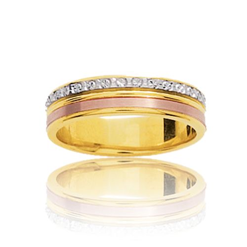 Alliance ruban en or jaune rehaussée d'un anneau latéral en or blanc finition lapidé diamanté et d'un anneau en or rose finition émerisé pour un effet mat.