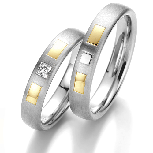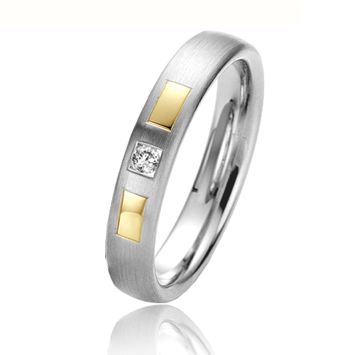 Un diamant taille brillant de 0.06 carats est serti au centre de l'alliance. Deux formes rectangulaires en or jaune poli sont à coté du diamant. La largeur de l'alliance est 4.5 mm. Le poids des diamants est 0.06 carats. La couleur des diamants est G (extra blanc) La pureté des diamants est VS ( Aucune inclusion visible à l'oeil nu).