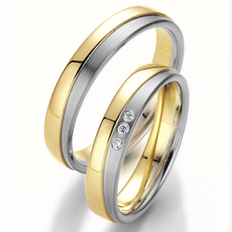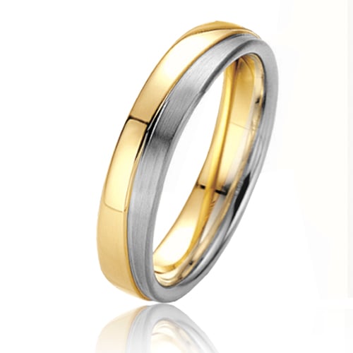 Alliance Twin Set Diamant 2 ors. L'or jaune de l'alliance est en or poli. L'or blanc est en or brossé pour un effet très moderne. Alliance disponible en 9, 14 ou 18 carats. La largeur de l'alliance est 4.5 mm.