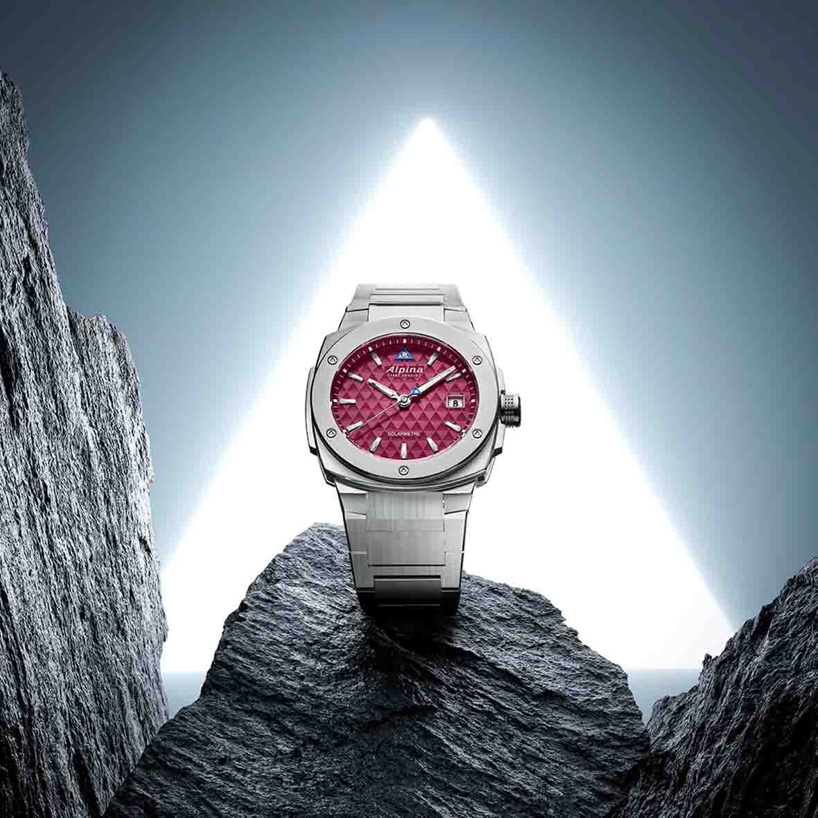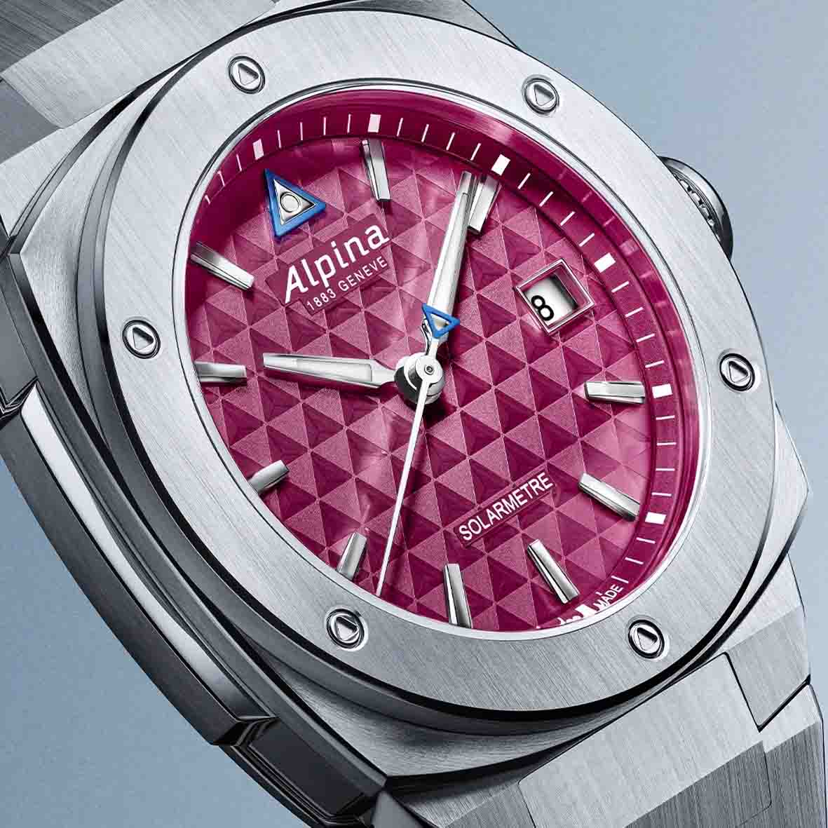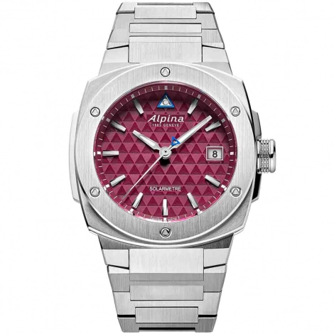 Son cadran rouge bordeaux est un véritable tour de force : il dissimule avec brio des cellules photovoltaïques avancées tout en conservant l'aspect opaque et raffiné des cadrans traditionnels de la Maison Alpina.