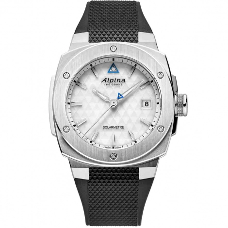 L'éclat du cadran blanc translucide est une prouesse esthétique à part entière, dissimulant astucieusement des cellules photovoltaïques avancées tout en conservant l'aspect opaque et raffiné des cadrans traditionnels de la Maison. Ses marqueurs horaires appliqués et ses aiguilles luminescentes, rehaussés par le motif triangulaire iconique d'Alpina et une touche de bleu subtile autour du logo et sur le contrepoids de la trotteuse, garantissent une lisibilité parfaite en toute circonstance. Le boîtier robuste de 37.50 x 38.90 mm en acier inoxydable, protégé par un verre saphir inrayable et une étanchéité de 100 mètres, est conçu pour résister aux épreuves du quotidien et de l'extrême. Son bracelet en silicone noir texturé, accompagné d'une boucle ardillon, assure un confort optimal et une allure résolument sportive.