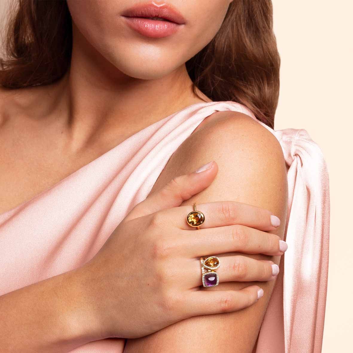 Bague Etna, améthyste et diamants sur or rose 750/1000 - One More 28 Diamant(s) taille brillant: 0.13 ct Vs F-G 1 Améthyste: 1.80 ct Largeur 12.6 mm Poids: 3 gr