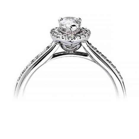 Le diamant central taille poire, serti par trois griffes fines, est entouré de diamants taille brillant qui intensifient sa lumière et accentuent sa forme gracieuse.