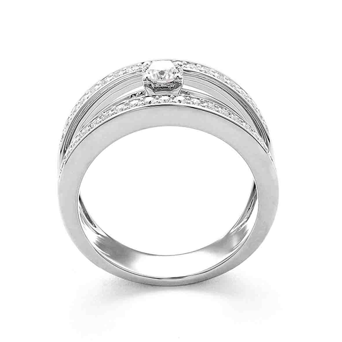 Cette bague unique est composée de trois anneaux sertis de diamants qui s’unissent harmonieusement pour former un ensemble étincelant.