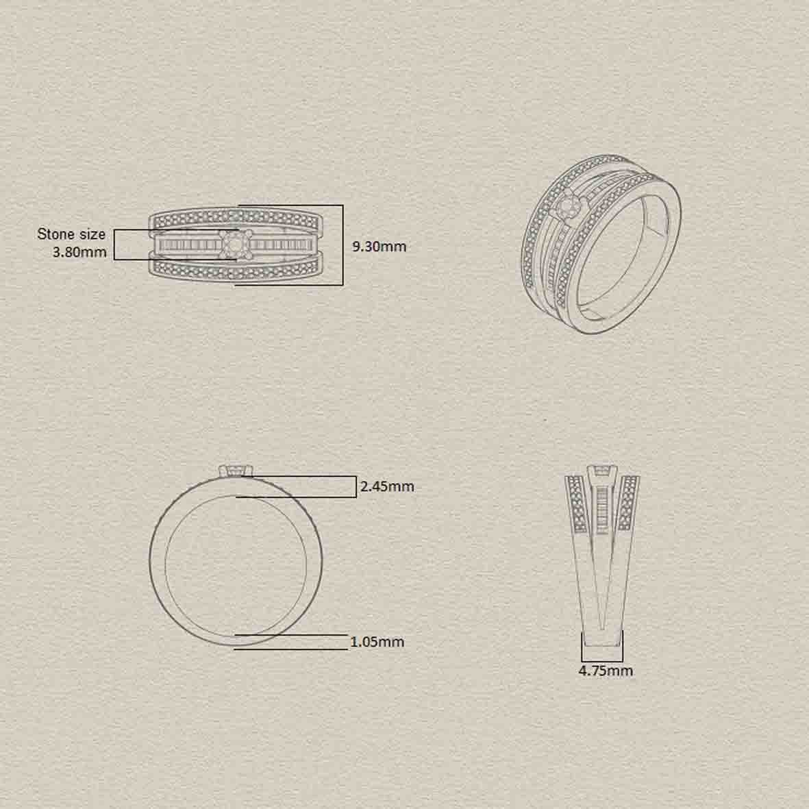 Les deux autres anneaux, positionnés légèrement plus haut, sont sertis de diamants taille brillant dans un serti grains d’une grande précision, apportant une touche de lumière continue et raffinée.