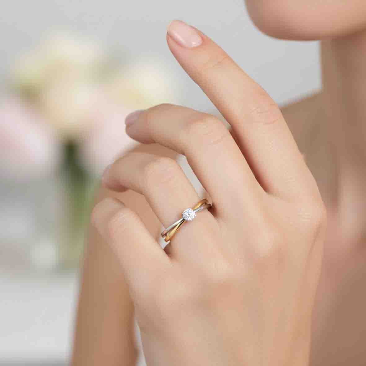 L’association des deux ors confère à cette bague une touche de modernité, tout en conservant la pureté des lignes d’un solitaire classique.