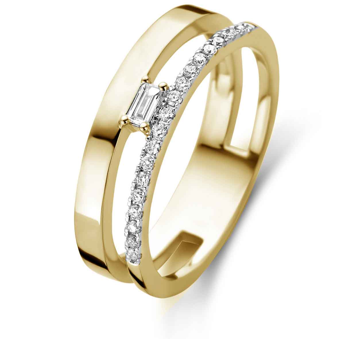 La bague est sertie de 0,11 carat de diamants naturels, dont un diamant baguette de 0,06 ct.