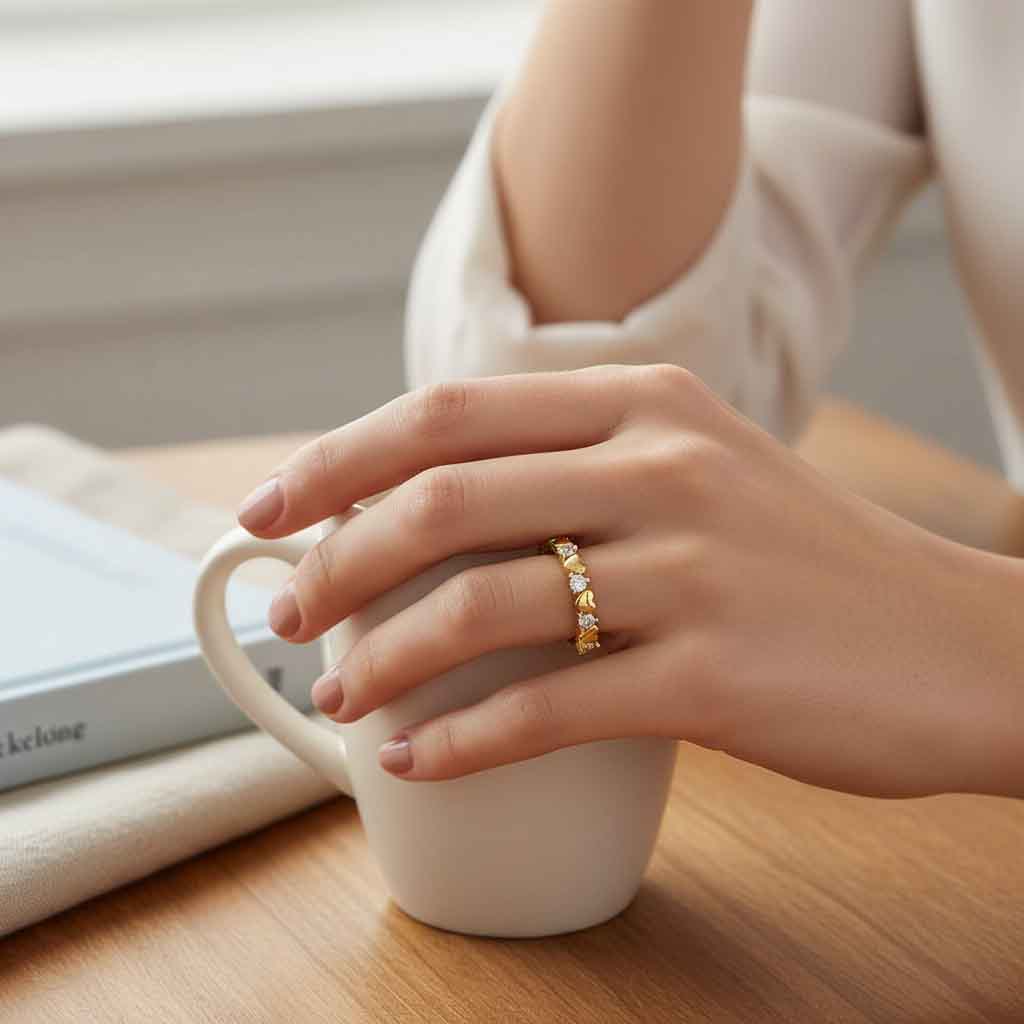 Cette bague diamants de style alliance avec des cœurs en or jaune 18 carats incarne la délicatesse et le romantisme à l’état pur.