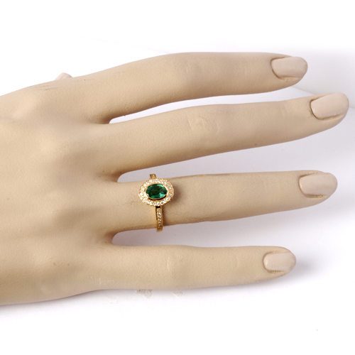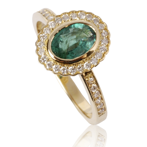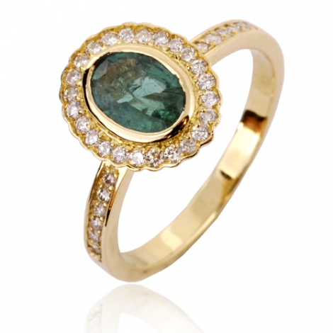 Cette bague émeraude et diamants est sertie d'une émeraude centrale et d'un entourage de diamants en serti grain. Le poids total des diamants est de 0.36 carat. La couleur des diamants est G (extra blanc).