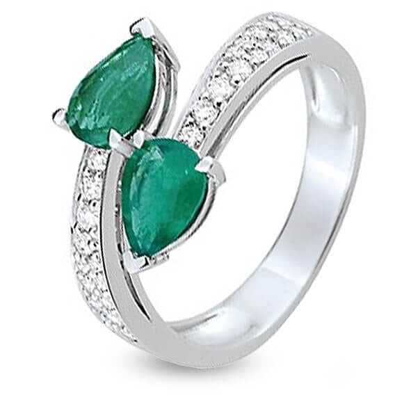 Cette bague toi et moi est originale avec ces deux rémeraudes en forme de poire qui sont sertis par 3 griffes pour un poids total de 1.04 ct