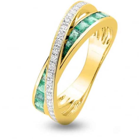 Bague Emeraude et Diamants or jaune 18 carats. La bague est serti de 0.88 ct d'émeraudes taille princesse d'une dimension de 2.1 mm pour chaque pierre. L'anneau qui passe au dessus des émeraudes est serti de 0.15 ct de diamants.