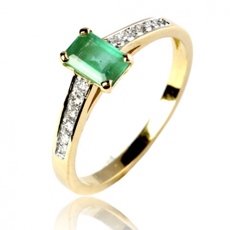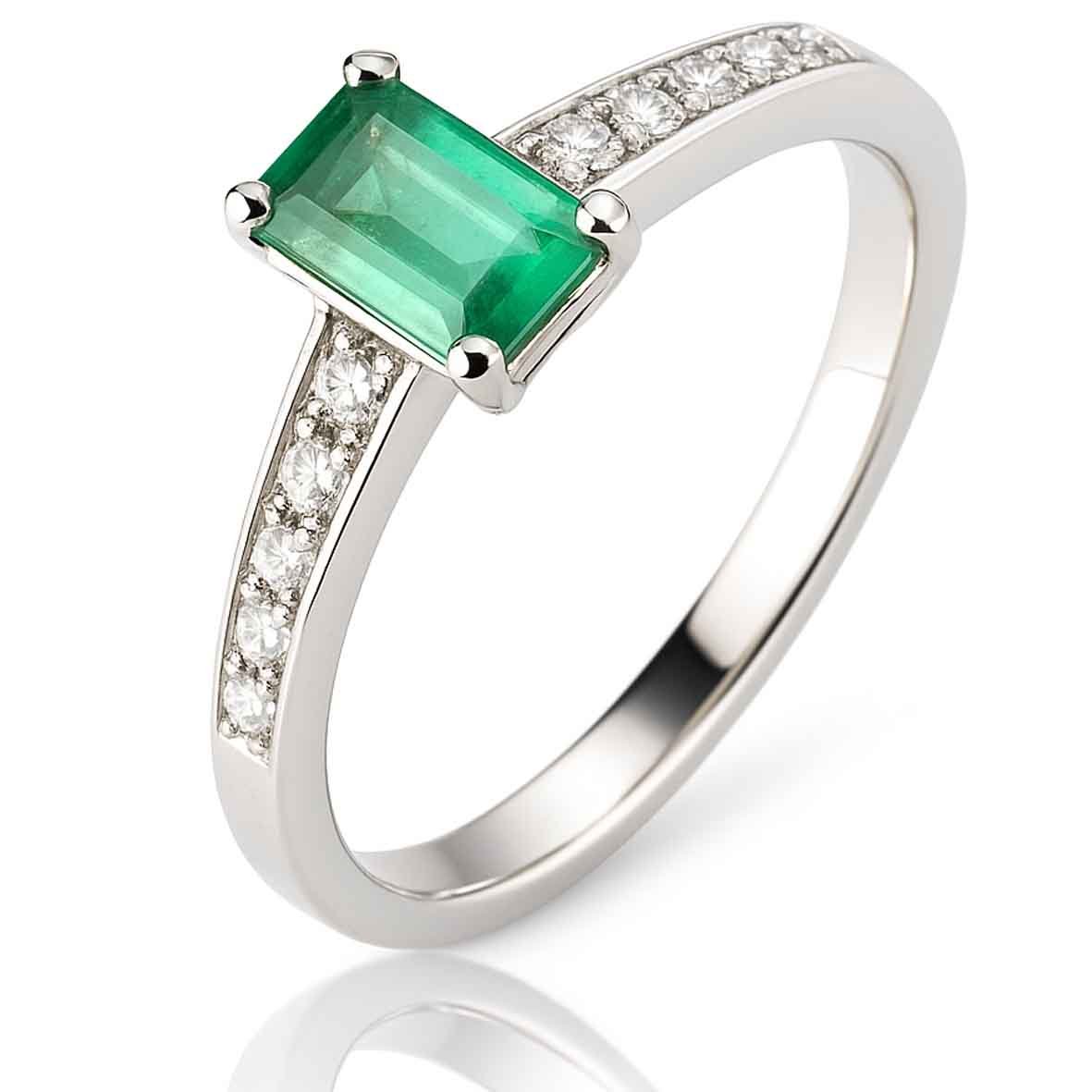 Cette création raffinée se distingue par son émeraude rectangulaire, d’une dimension de 6 x 4 mm et d’un poids de 0,50 carat, mise en valeur par un serti à quatre griffes.