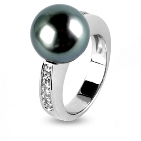 La perle de tahiti est mise en avant grâce au pavage diamants. Le diamètre de la bague perle est de 11 mm. La bague perle est sertie de 0.18 carats de diamants de couleur G (extra blanc).