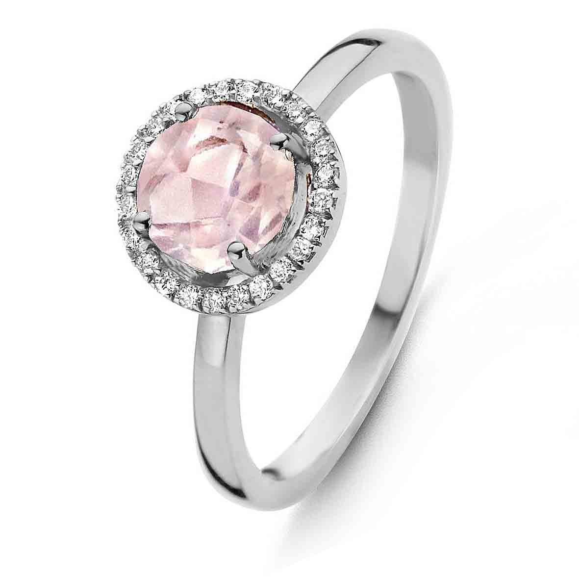 la bague a un corps en or blanc, le quartz rose est serti par 4 griffes entouré de 24 diamants.