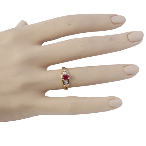 Cette pierre précieuse, symbole d’amour passionné, est accompagnée de quatre diamants ronds naturels, deux de chaque côté du rubis, pour un poids total de 0,09 carat.