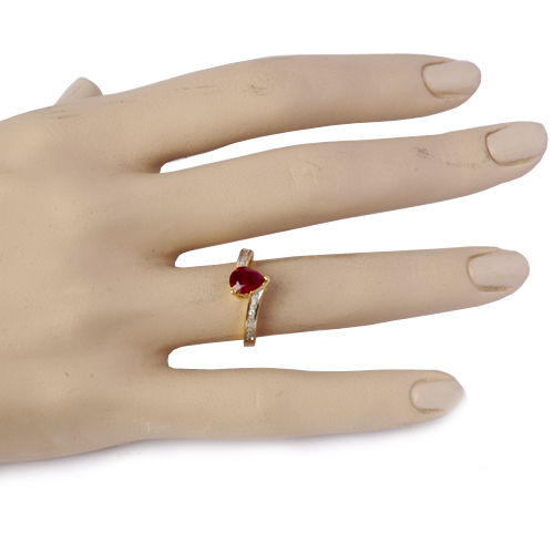 La bague est ornée d’un magnifique rubis rouge de 1.2 carat, taillé en forme de poire, symbole d’amour et de féminité.