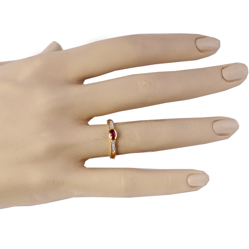 Le corps demi bombé de la bague met en valeur un rubis rouge éclatant de 0.30 carat, mesurant 4 x 3 mm.