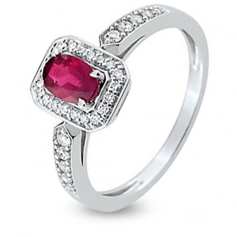 Le corps de bague serti de diamants par un sertissage grain se finit en palmette qui vient se fixer sur un chaton taille émeraude qui a en son centre un rubis ovale qui est serti par 4 griffes.