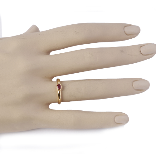 La monture au corps demi bombé épouse délicatement le doigt et met en valeur un superbe rubis rouge de 0.30 carat, mesurant 4 x 3 mm. Sertie en clos, la pierre est à la fois protégée et magnifiée, reflétant une lumière douce et chaleureuse.