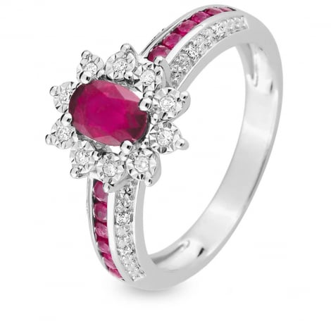 Le rubis est entouré de pétales de diamants avec un sertissage particulier permettant avec les différentes facettes de faire étinceler la bague rubis et donner l'impression d'avoir des plus gros diamants.