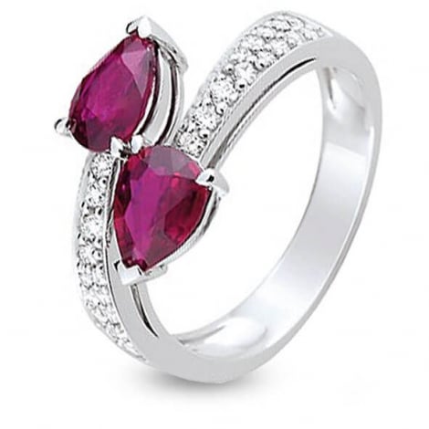 Cette bague toi et moi est originale avec ces deux rubis en forme de poire qui sont sertis par 3 griffes pour un poids total de 1.78 ct