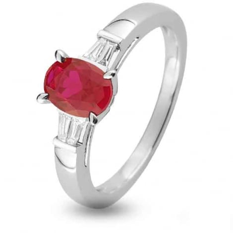 Bague saphir et diamants en or blanc de 18 carats. Le corps de bague légèrement arrondi serti des diamants taille baguettes vers le châton.Le saphir ovale Kanchana a un poids de 0.92 ct pour une dimension de 7 x 5 mm.
