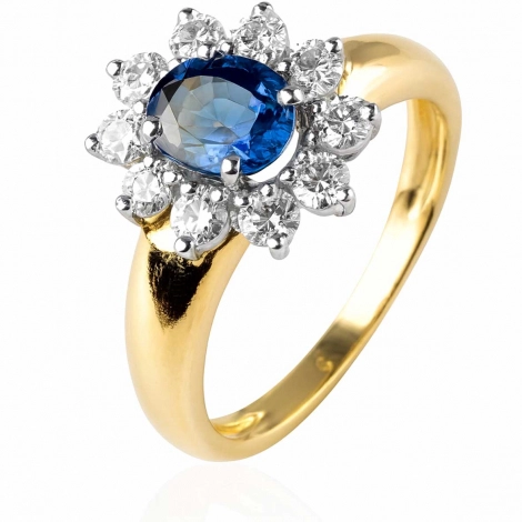 La monture en or blanc ou or jaune 18 carats (750/1000) souligne le contraste entre le bleu profond du saphir et l’éclat des diamants pour un rendu floral sophistiqué.
