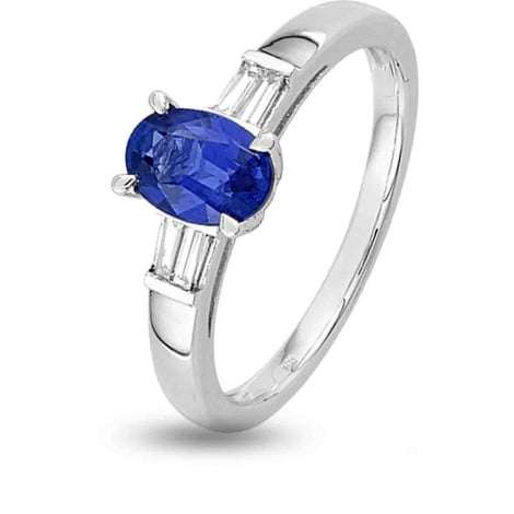 Bague saphir et diamants en or blanc de 18 carats. Le corps de bague légèrement arrondi serti des diamants taille baguettes vers le châton.Le saphir ovale Kanchana a un poids de 0.92 ct pour une dimension de 7 x 5 mm.
