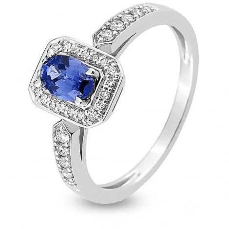 Le corps de bague serti de diamants par un sertissage grain se finit en palmette qui vient se fixer sur un chaton taille émeraude qui a en son centre un saphir ovale de couleur bleu qui est serti par 4 griffes.