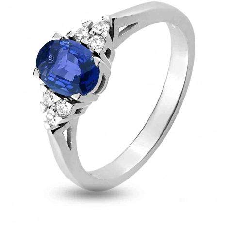 Bague saphir et diamants en or blanc de 18 carats. Les palmettes du corps de bague viennent se positionner su un châton serti de 6 diamants d'un poids total de 0.15 ct Le saphir ovale du Kanchana a un poids de 0.92 ct pour une dimension de 7 x 5 mm