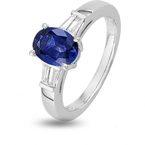 Bague saphir et diamants en or blanc de 18 carats. Le corps de bague légèrement arrondi serti des diamants taille baguettes vers le châton.Le saphir ovale Kanchana a un poids de 1.56 ct pour une dimension de 8 x 6 mm.