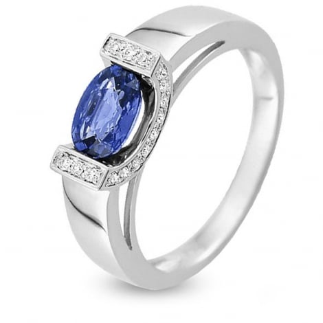 Bague saphir et diamants en or blanc de 18 carats. Le corps de bague large vient sertir par un chaton en forme de "C" serti de 0.10 ct de diamants. Le saphir est en suspension permettant de voir sa culasse. Le saphir bleu a un poids de 1.20 ct