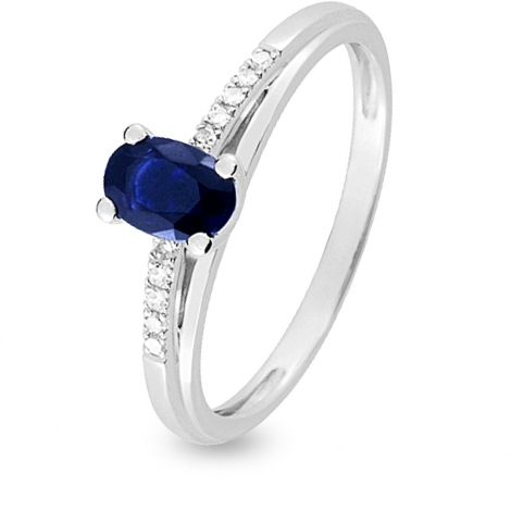 Bague saphir et diamants en or blanc de 18 carats. Un corps de bague fin est serti de 0.05 ct de diamant. Le chaton 4 griffes serti un saphir ovale de couleur bleu.
