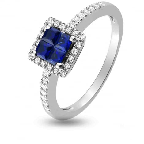 Bague saphir en or blanc de 18 carats 4 saphirs carré d'une dimension de 2.5 mm sont sertis pour former un carré entouré de 0.19 ct de diamants Le corps de bague est lui aussi serti de diamants.