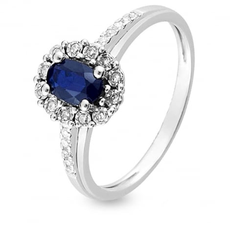 Bague saphir et diamants en or blanc de 18 carats. Le corps de bague est singulier avec une partie sertie de diamants. Le chaton en forme de fleur est serti d'un saphir bleu de forme ovale entouré de diamants taille brillant