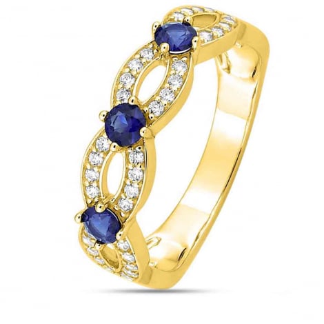 Bague saphir en or jaune 18 carats. La bague est serti de 0.22 ct de diamants et de 3 saphirs de 3.mm de diamètre.
