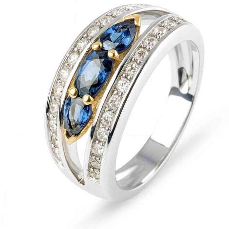 Bague avec trois saphirs, de type trilogie de saphirs, et diamants deux ors 18 carats.
