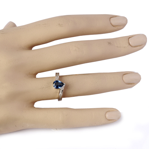 Le saphir de forme poire de cette bague est accompagné d'un pavage de diamants de 0,14 ct.
