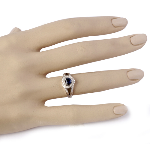 Cette bague en or blanc est sertie d'un saphir de forme coeur et sertie de diamants.