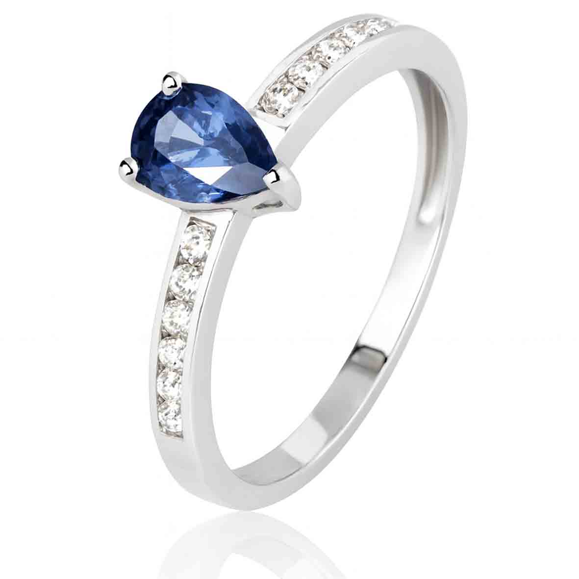 Bague saphir de forme poire accompagnée d'un pavage de diamants de chaque coté.