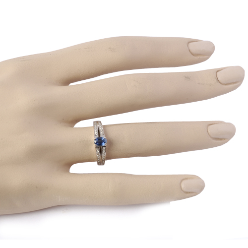 Le saphir de forme ovale en haut de la bague est accompagné d'un double pavage de diamants de chaque coté.