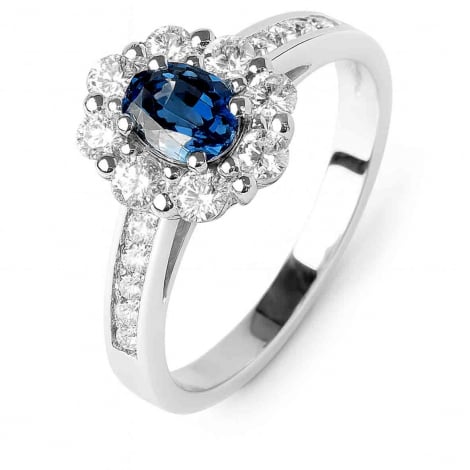 Chaque diamant, monté en serti griffes, reflète la lumière sous tous les angles, amplifiant la beauté du saphir ovale de 0,60 carat (6 x 4 mm).
