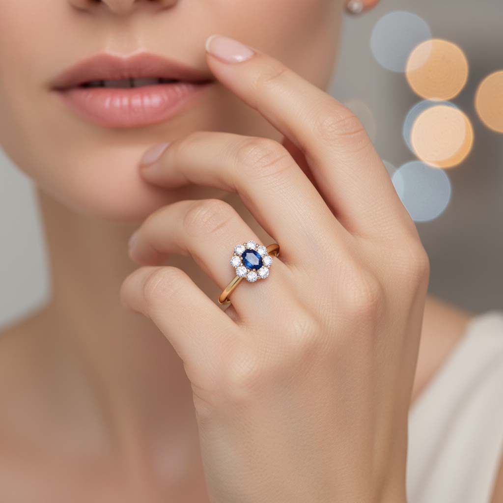 Le contraste entre le bleu profond du saphir et la brillance des diamants G-VS crée un rendu particulièrement harmonieux et raffiné.